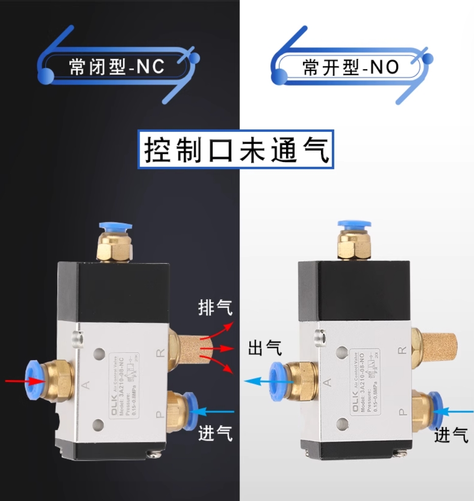 NC (нормально закритий): клапан закритий, коли немає повітря, і його можна відкрити лише після того, як він буде керований сигналом/тиском повітря.