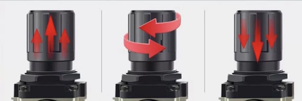 На ковпачку регулювання є шкала тиску. Коли подається повітря, потягніть ручку вгору та поверніть її за годинниковою стрілкою до знака «+», щоб збільшити тиск. Після регулювання натисніть ручку вниз, щоб зафіксувати її.