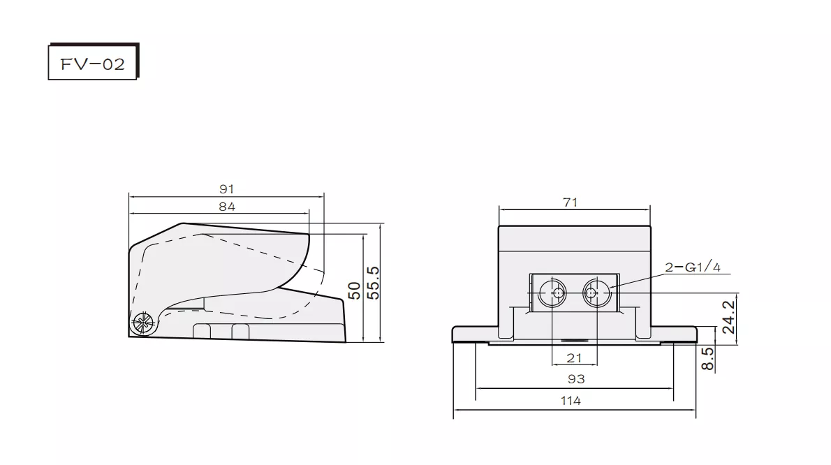 Компактний 3-ходовий пневматичний педальний клапан FV-02 виготовлений з чорного алюмінієвого сплаву. Двопозиційна триходова, прямої дії, нормально закрита конструкція, з автоматичним поверненням пружини. Просто натисніть на педаль, щоб провітритися. При виборі роз'ємів рекомендується використовувати прямі роз'єми ПК, які прості в експлуатації і зручні. Порт P для впуску та вихідний отвір A для випуску. Вбудований випускний отвір R. Завдяки простій структурі «один в одному» виріб підходить для керування відкриттям і закриттям єдиного повітряного тракту, наприклад, напівавтоматичного невеликого обладнання або випробувальних стендів.