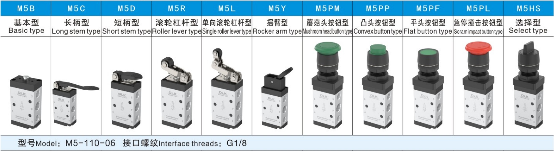 M5 Механічний клапан становить 2 положення 5 способів; М3 Механічний клапан - 2 Позакція 3 Шлях.
