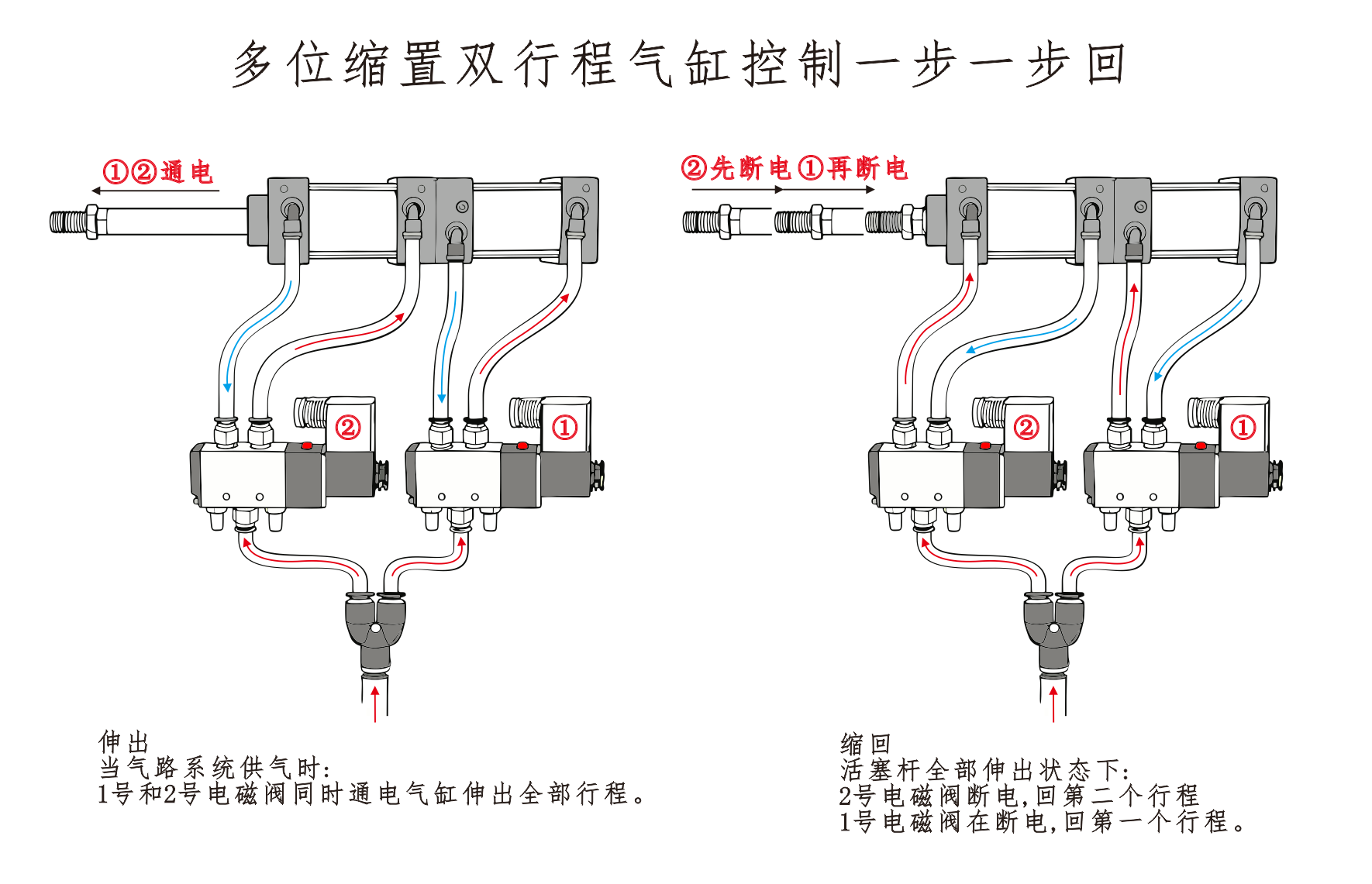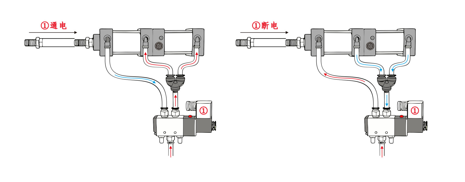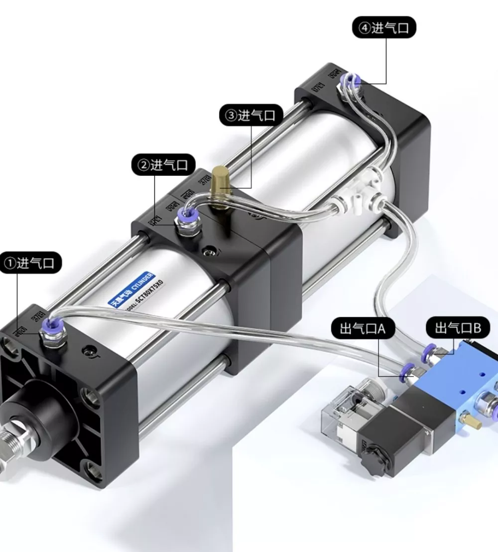 Повітрозабірник циліндра①з’єднаний з портом A електромагнітного клапана, а повітрозабірник циліндра④з’єднаний послідовно з портом B електромагнітного клапана. Повітрозабірник циліндра③ з’єднаний із глушником. Коли порт А електромагнітного клапана подається під напругу, циліндри залишаються у втягнутому положенні. Коли на порт B подається напруга, циліндри починають працювати.