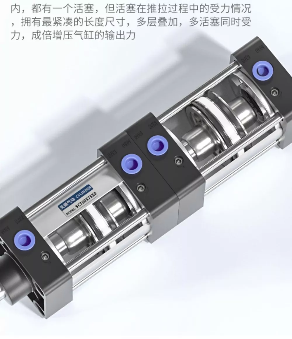 Циліндр тяги SCT оснащений двонаправленими ущільнювальними кільцями YCC і потужною двотактною конструкцією з компактним і вишуканим зовнішнім виглядом, який забезпечує швидку дію та плавний, стабільний вихід. Кожен шар циліндра містить окремий поршень, і під час процесу штовхання-тягни кілька поршнів розподіляють навантаження, дозволяючи циліндру досягти найкомпактнішої довжини, одночасно генеруючи багатошарову вихідну силу через його багатошарову структуру. Ця конструкція з подвійним зусиллям забезпечує більшу потужність, а конфігурація з шести ущільнювальних кілець забезпечує відмінні характеристики ущільнення, дозволяючи циліндру витримувати тиск до 1,4 МПа без витоку.