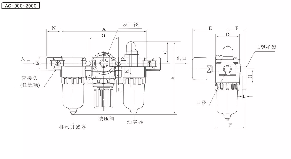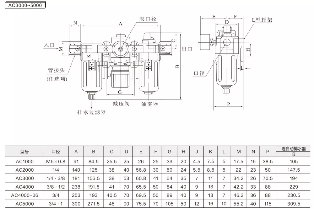 AF (повітряний фільтр) + AR (клапан регулювання тиску) + AL (змащувач масляного туману) = AC Triple Unit