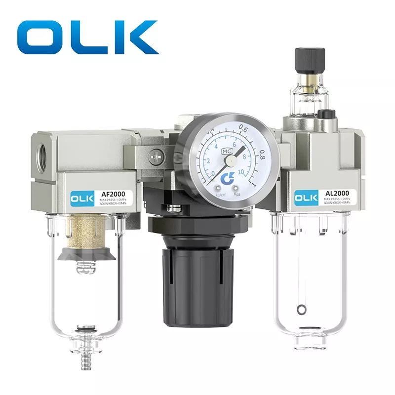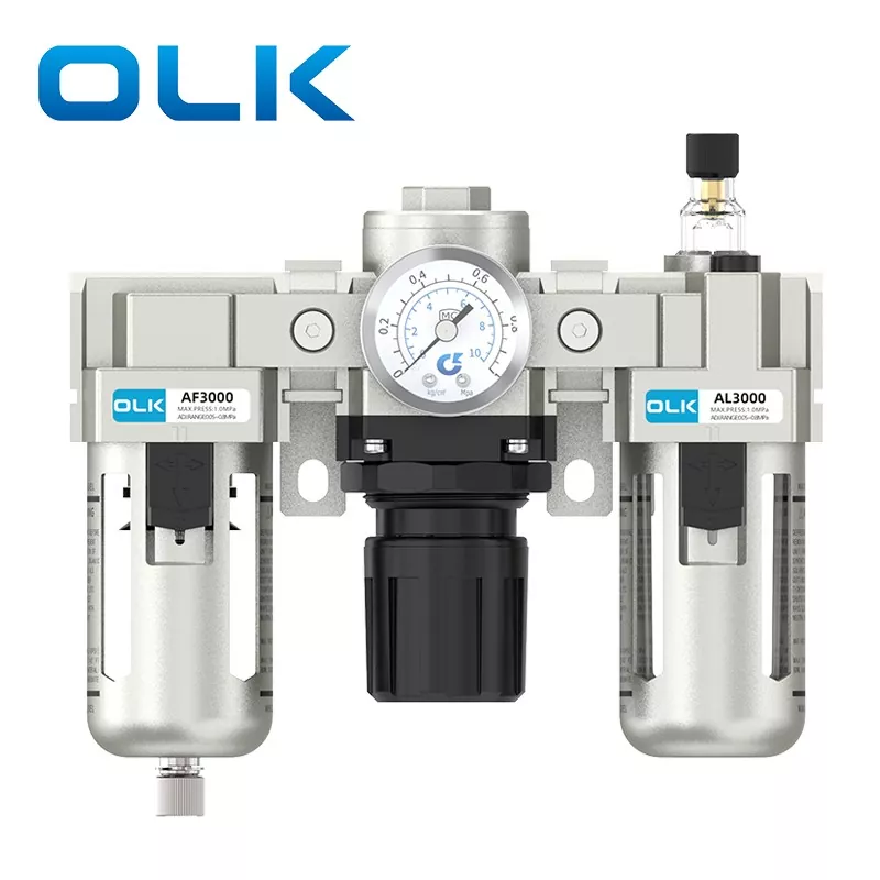 Блок SMC типу AC FRL (фільтр-регулятор-мастило) є основним пневматичним компонентом, який об’єднує фільтрацію джерела повітря, зниження та регулювання тиску, а також обробку змащення. Він забезпечує чисте, стабільне та змащене стиснене повітря для пневматичних систем, тим самим подовжуючи термін служби пневматичних компонентів і підвищуючи стабільність системи. Блок FRL серії OLK AC діє як важливий «охоронець» сучасних пневматичних систем.
